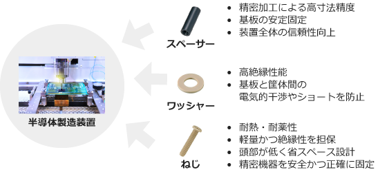精密加工・高絶縁素材・耐溶剤仕様の各種部品でトータルにサポートします
