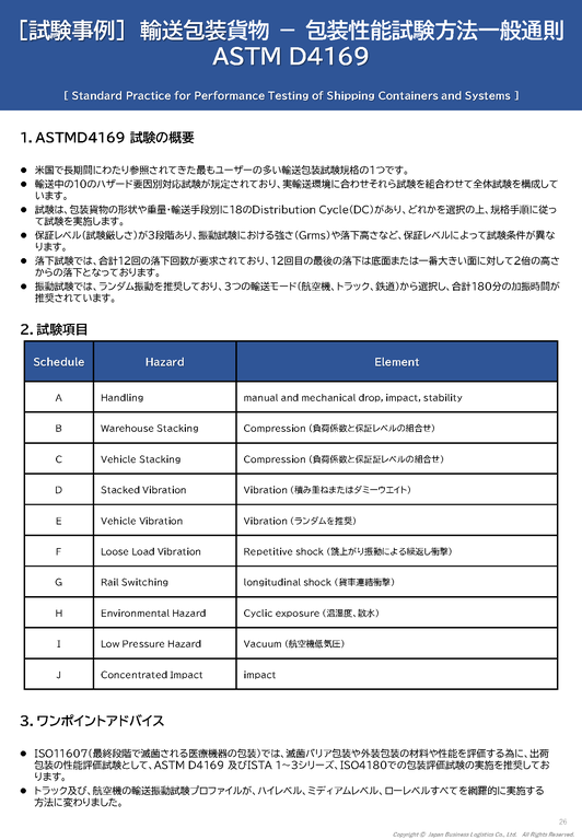 - 小口貨物からパレタイズ貨物のような大型重量物貨物までを対応でき、ASTM D4169を全項目実施できる試験機関が見つからない