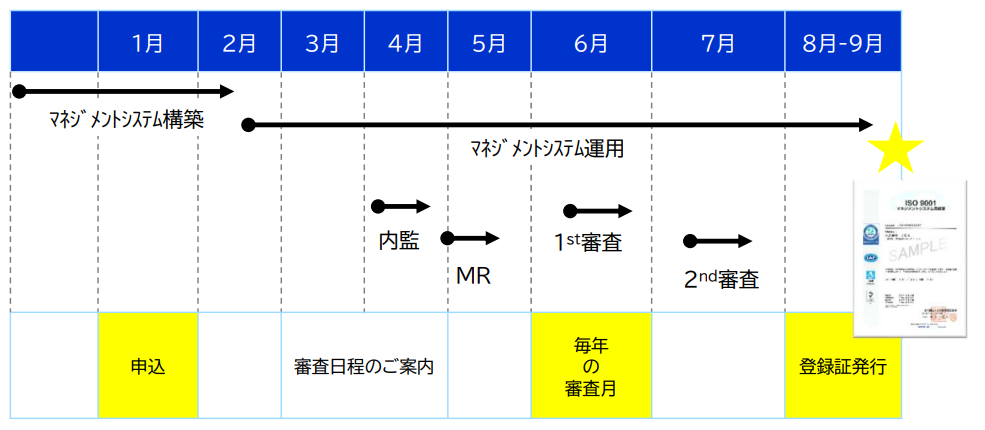 A:おおむね 1 年間かかります。ただし、ISO 9001 や ISO 14001 の認証を取得済みであるなど、お客さまの準備体制によって期間は大きく異なります。