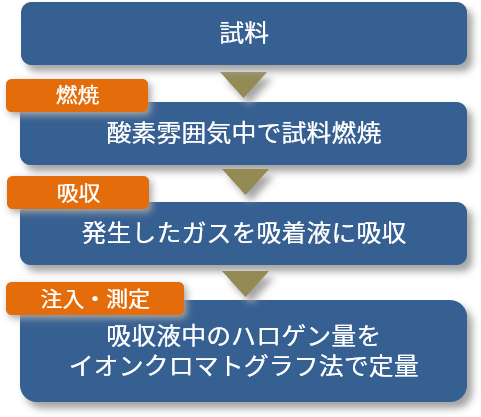 試料を加熱部(石英管内)で完全燃焼させ、発生したハロゲンガスを吸収液 に捕集します。 吸収液中のハロゲンをイオンクロマトグラフで測定し、材料中のハロゲン含有量を求めます。