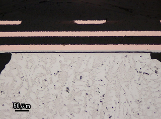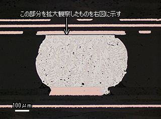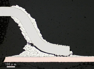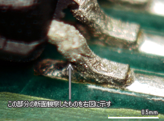 ICリード端子接続部の不具合事例(配線基板接続部の剥離)が同一試料内で、外観上、つながっている様に見える端子の断面を観察しました。
