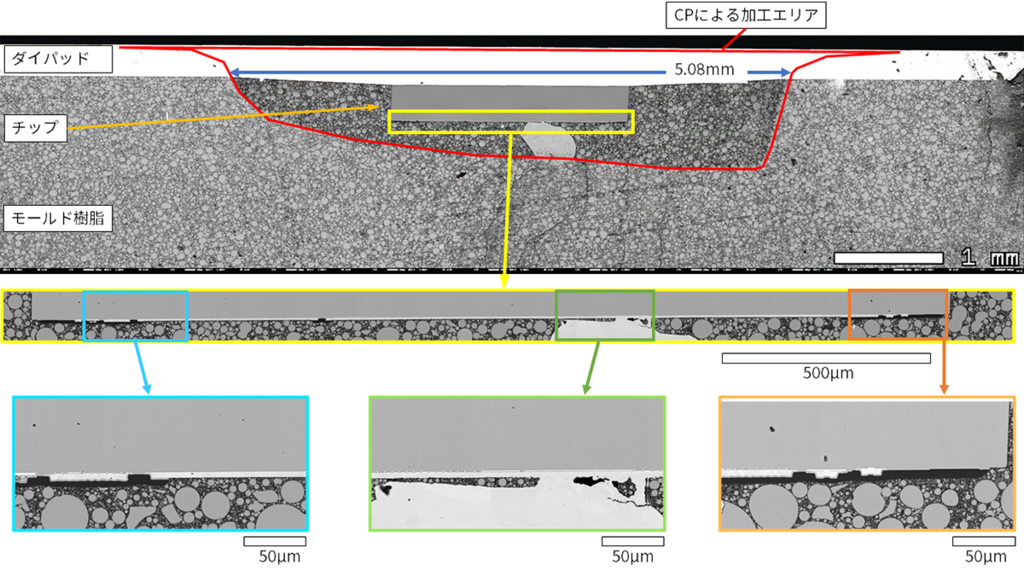 | CP断面加工・観察例:パワーデバイス(SiC)のチップ実装状態 |