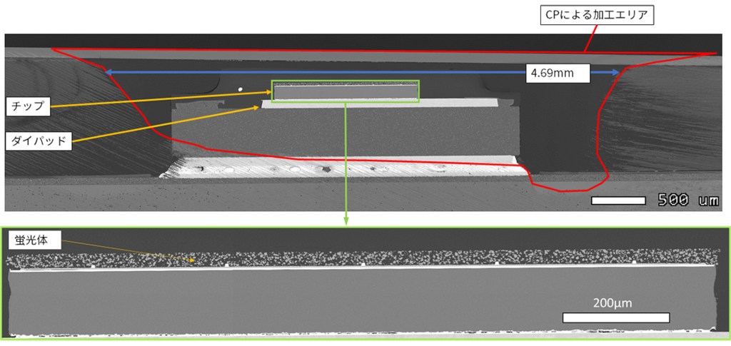 | CP断面加工・観察例:LEDのチップ積層状態、蛍光体接続状態 |