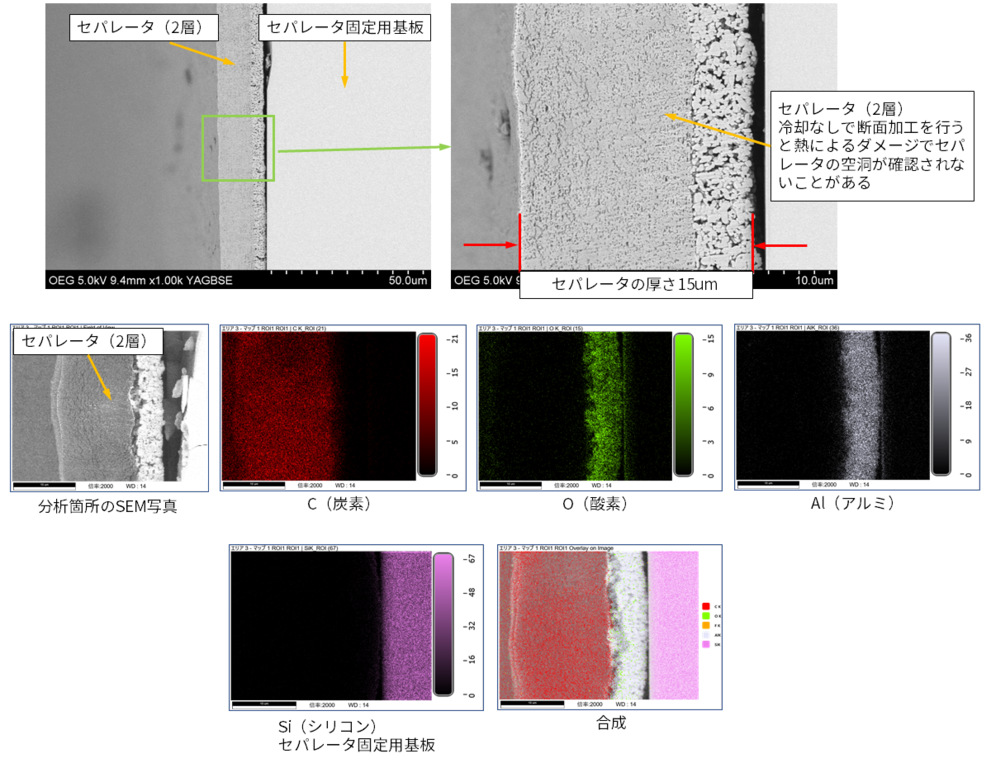 - 試料を冷却しながらのCP加工により、加工時の物理ダメージや熱ダメージを抑えた加工を実施しました。観察およびSEM-EDSの元素分析(※1)により、セパレータに使用されている元素の特定を行った例となります。