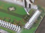 QFPやSOPなどの部品のリードと基板の接続強度を測定評価します。 対象を45度に設置し、リード部分にフックを引っかけ垂直方向に引っ 張り剥がれたときの強度を測定評価する方法:JIS Z 3198-6規格も対応可能です。