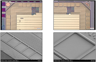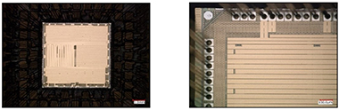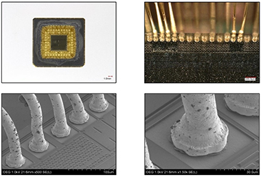 内部検査はOM(光学顕微鏡)およびSEM(走査型電子顕微鏡)にて観察可能な内部全体、チップ搭載状態等の検査を実施します。 |