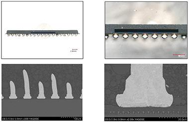 | パッケージ断面は樹脂埋め込みした試料に対して、断面加工(鏡面研磨)にて対象の内部構造をOM(光学顕微鏡)およびSEM(走査型電子顕微鏡)で検査します。 | |