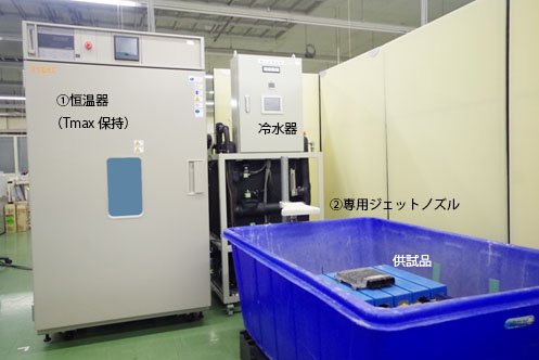 0℃~+4℃の冷水を放水し、雨や雪で濡れた道路走行時の冷たい跳ね水がエンジンルーム近傍の高温部品にかかることを模擬する熱衝撃試験です。