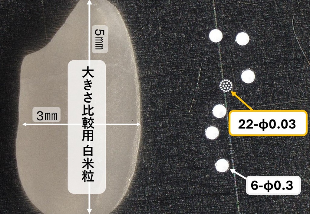 今回は金属素材を使った微小加工をご紹介します。写真は約2㎜四方の範囲内に、64本の微小な円柱パイプ形状を設けたサンプル。パイプを差し込んだり接合したりはせず、一体で完成させています。穴は貫通していますの…