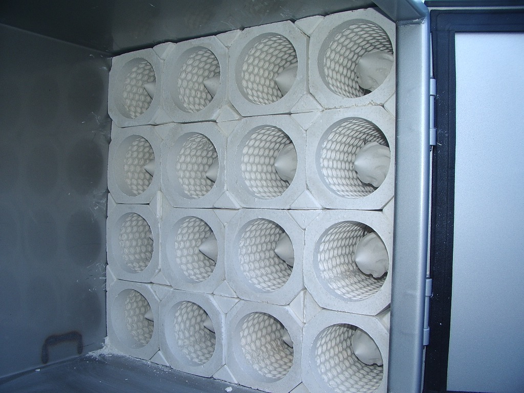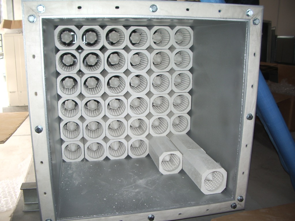 専用の収納容器(チャンバー)を製作してその中にセラ・ブロックを充填します。 チャンバーの寸法は風量に比例して断面積が大きくなります。処理前の臭気が強いほど、除去率が高いほど、奥行きが長くなります。 セラ・ブロックの充填数量もチャンバーの大きさに比例して増加します。 特殊な触媒セラミックスにより超寿命効果があるので、10年以上の無交換連続使用も珍しくありません。20年連続で使用した例もあります。 |