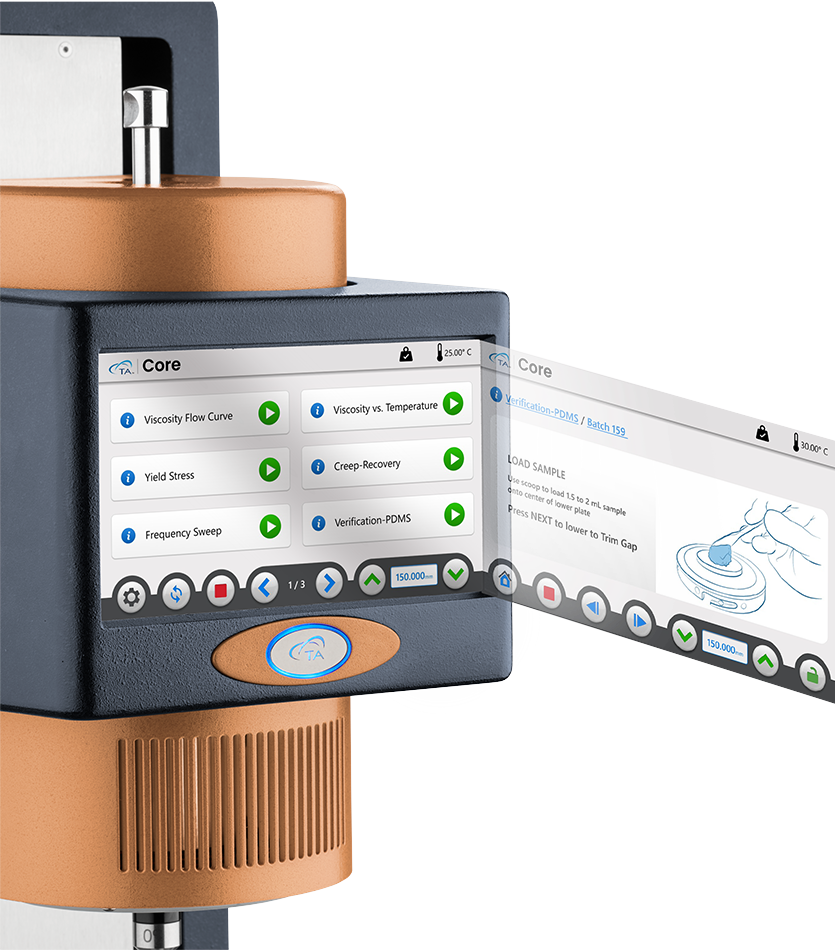 - 定義済みのメソッドと画面上の指示とイラストが、オペレーターの動作を段階的なワークフローでガイドし、最小限のトレーニングで全てのユーザーがレオロジー測定を成功させることができます。