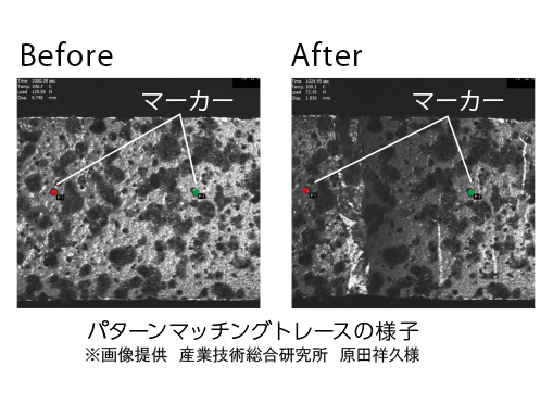 耐高温マーカーをスプレーしたサンプルを使い任意の変位をリアルタイムで測長することが可能です。