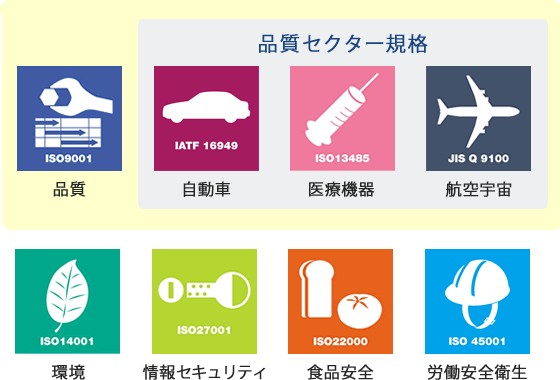 ISO 9001はどのような業界でも使用できる規格であり普遍的な内容にまとめられたものですが、それぞれの業界でより実践的に使用できるよう、ISO 9001をベースに業界固有の要素について追加要求事項を規定したものがセクター規格です。具体的には、IATF 16949(自動車)やISO 13485(医療機器・体外診断用医薬品)、JIS Q 9100(航空宇宙)などが挙げられます。
