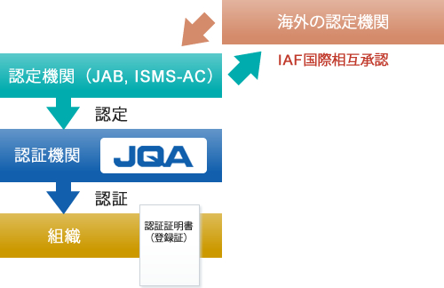 日本国内には約50社の認証機関がありますが、認証機関の信頼性を保証する仕組みとして、グローバルな「認定」の制度があります。日本には日本適合性認定協会(JAB)と情報マネジメントシステム認定センター(ISMS-AC)という二つの認定機関があり、JQAを含む認証機関はこれらの認定機関からお墨付き(認定)を得て認証を行っています。
