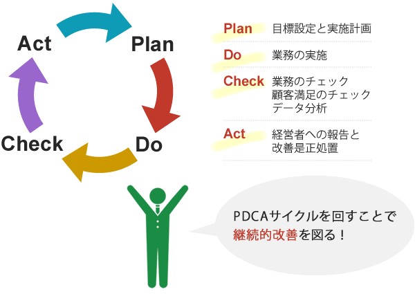 次に、課題を解決するための「計画・方策(Plan)」を立て、それを「実施(Do)」します。さらに実施した結果が課題の解決につながったかどうかを検証し、必要に応じて課題を「見直し(Check)」たり、実施方法を変更するなどの「改善(Act)」をして、次の活動に繋げていきます。