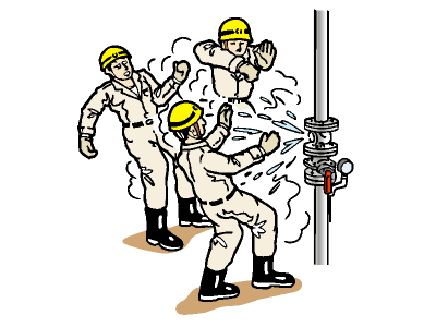 安全シールドは、高圧な流体が流れる配管接続部(フランジやバルブ)からの突発的な液体の漏洩による、作業者への危険を防止。酸・アルカリリークペイントは、液体の漏洩を即座に発見し、迅速な対応と安全環境の維持を可能にします。