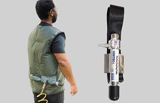 ボルテックスクーラーと専用ウェアを組み合わせた個人用温度調整システム。圧縮空気を利用し、ベストや防護服の内部に直接冷気を送り込みます。手元のコントロールノブで風量の調整ができ、作業者一人ひとりを冷却します。