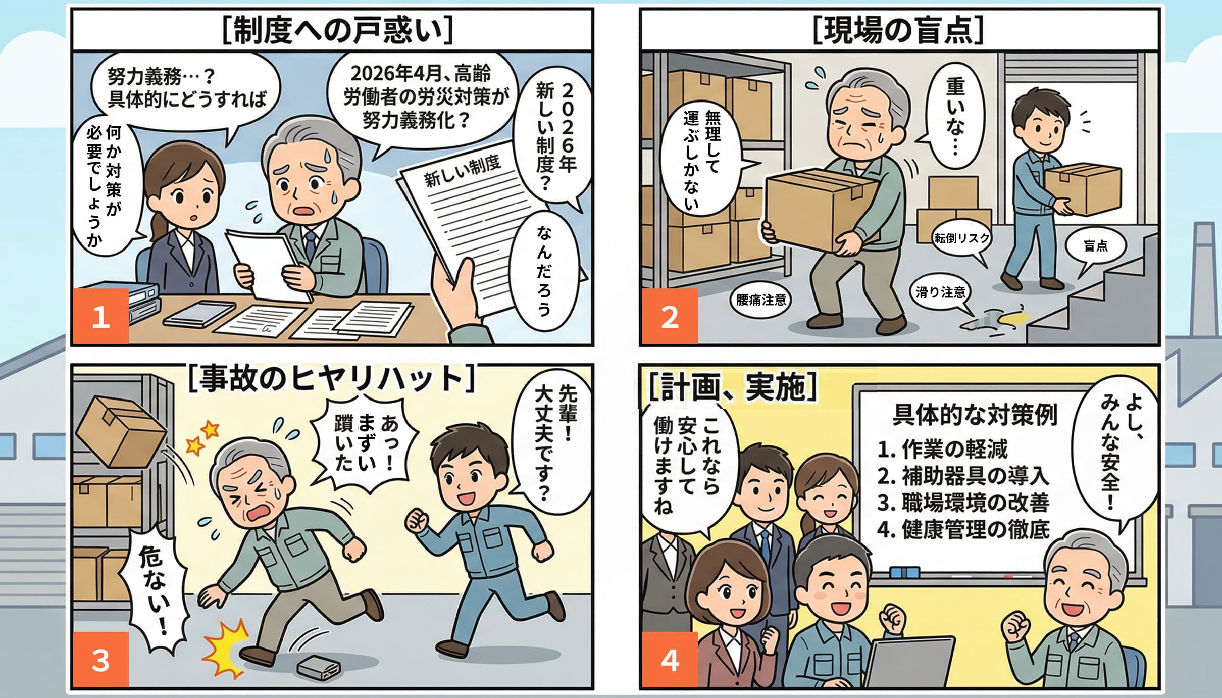 令和8年4月施行予定の法改正により、高年齢労働者の労災防止対策が努力義務化されました。高年齢労働者の労働災害対策コーナーでは、重量物の運搬作業による腰部への負担や、高温環境下での熱中症など、高年齢者において発生しやすい労災事例とその対策をご紹介します。