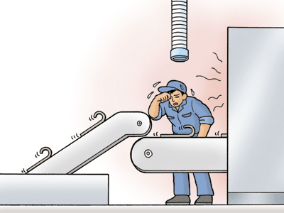 板バネ製造工程で焼き入れされた板バネの検査作業中、作業者が熱中症にかかる