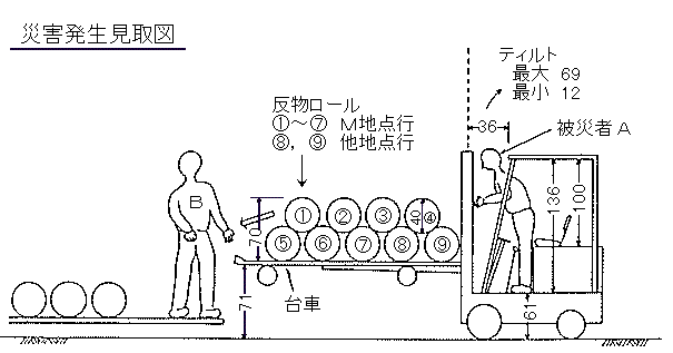 Bは地上から71cmの高さの台車上から、反物をつぎつぎに転がしながら地上におろしていた。台車上の反物が3個となったときふとフォークリフトの方に向くと、Aがフォークリフトのヘッドガードとマストのフレームとの間にはさまれているのを発見した。
