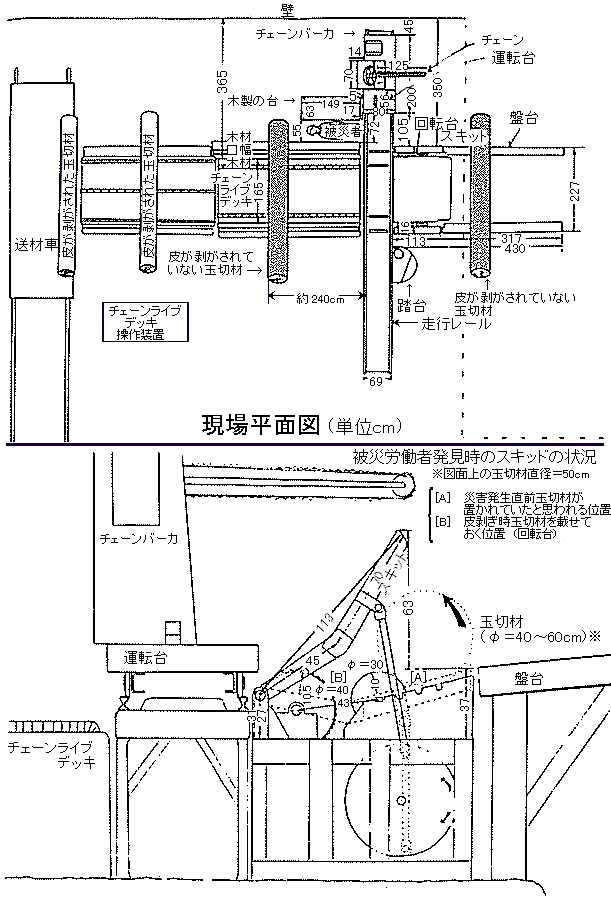 (一) チェーンバーカのスキッドは、本来、皮を剥ぎ終わった回転台上の玉切り材をチェーンライブデッキまで移動させる装置であるが、これを本来の用途とは異なる盤台上の玉切り材を回転台へセットするために使用し、さらに、その際、誤操作によりスキッドを上昇させすぎたため、セット位置をオーバーさせ玉切り材をレール上までころがし落としたこと。