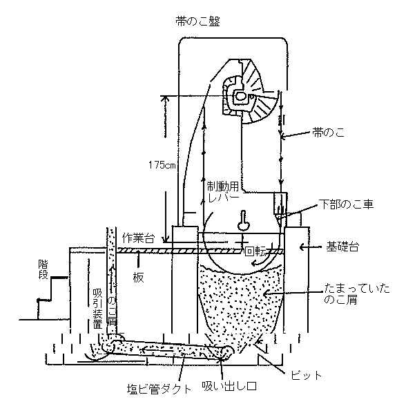 午後になって、ハンドルマンは帯のこの交換を行い、製材作業を続けていたが、ピット内に堆積したのこ屑がピット上部から吹き出すようになり、作業ができなくなったため、近くで掃除を行っていた被災者にピット内ののこ屑の掃除をするよう指示した。