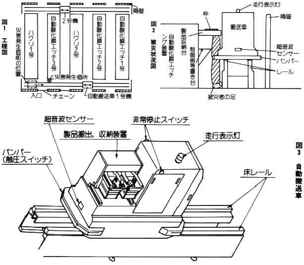 自動搬送車の安全装置としては、前後に超音波センサーおよび触圧スイッチ(バンパーの接触により作動)と左右に非常停止ボタンが設置されている。当時の安全装置の状況は、超音波センサーの感知範囲が角度20度、距離1.2m以内のため、Aの位置では感知しなかった。このため、バンパーに内蔵されている触圧スイッチは、Aに接触したが、側面での接触のためスイッチ作動が遅れたことなどのため、はさまれ負傷したものである。