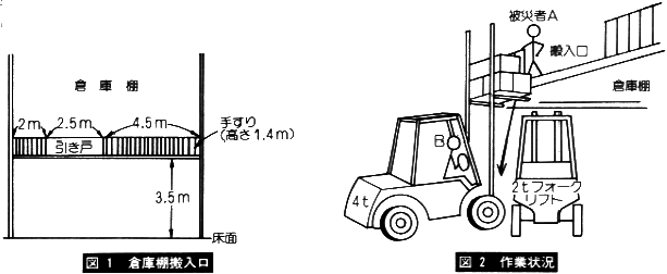 この日、Aは同僚Bと共同して同工場の倉庫棚へ送風機のモーター等の部品を搬入することとなった。この倉庫棚は、図1に示すように階下の床面から約3.5mの高さにあり、荷の搬入側は全長約9m、そのうち約2.5mは高さ1.4mの鋼製の引き戸となっていた。